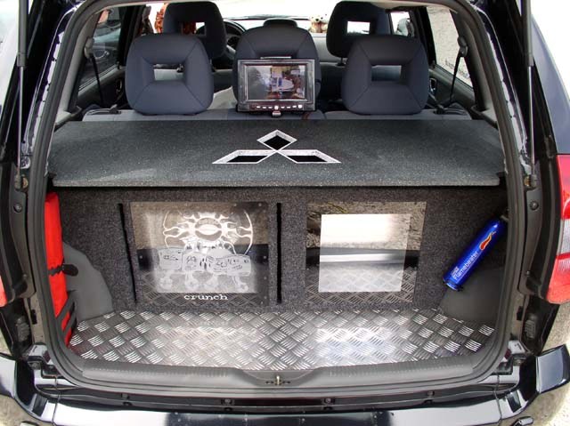 Grauem Akustikvlies. Zum Abschluss fertigten wir noch eine Heckablage mit einem Ausgefrästem Mitsubishi Zeichen an. Diese wurde mit Schwarzem Marmor-Effektlack Lackiert. Zudem verbaute ich noch ein Sony MP3 Radio,